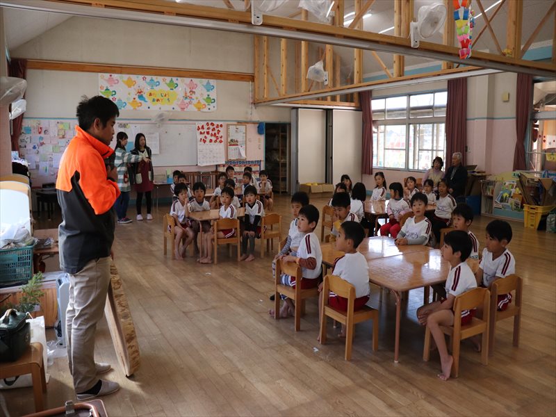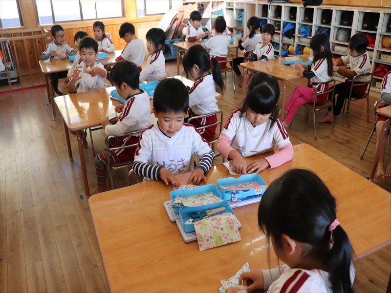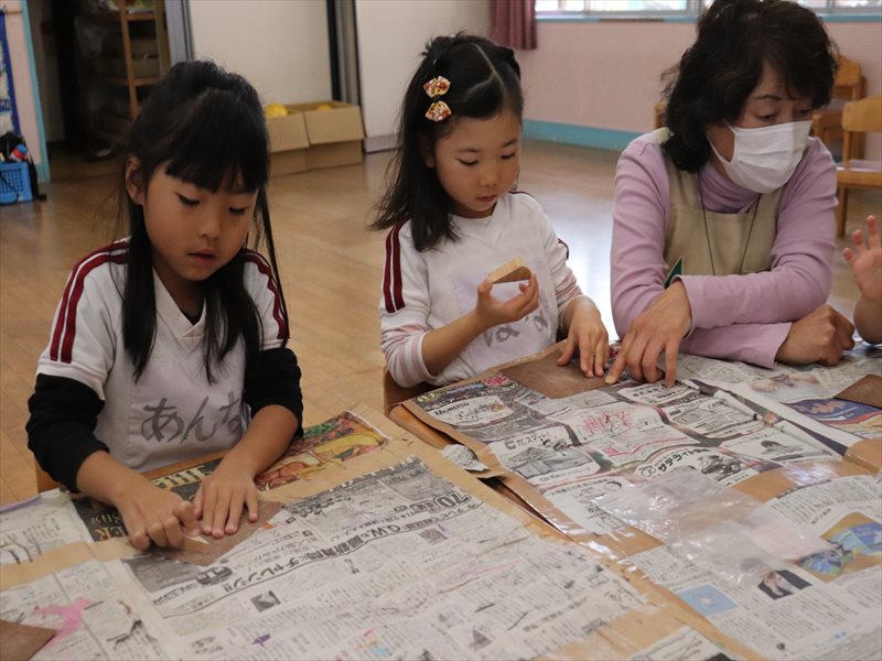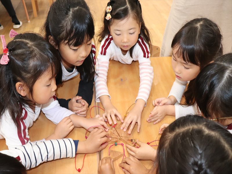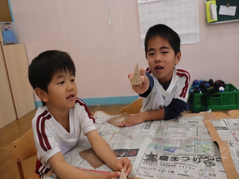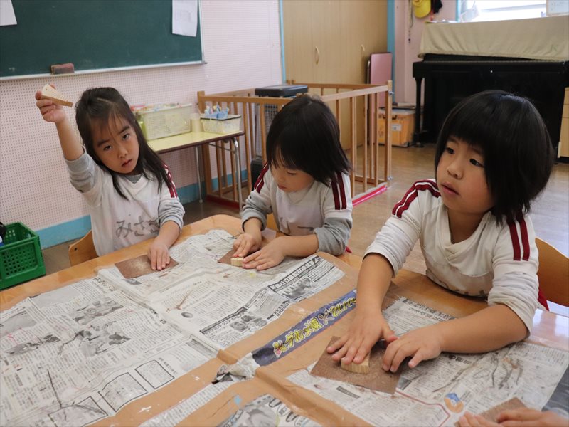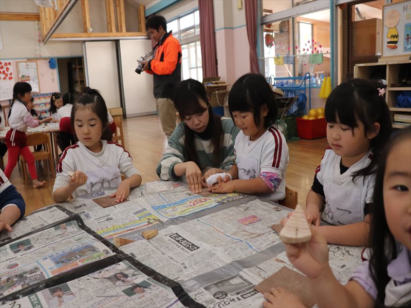 年長さん、宮崎県 木育ネットワークの方々が来て下さり、木のお守り作りをしました。