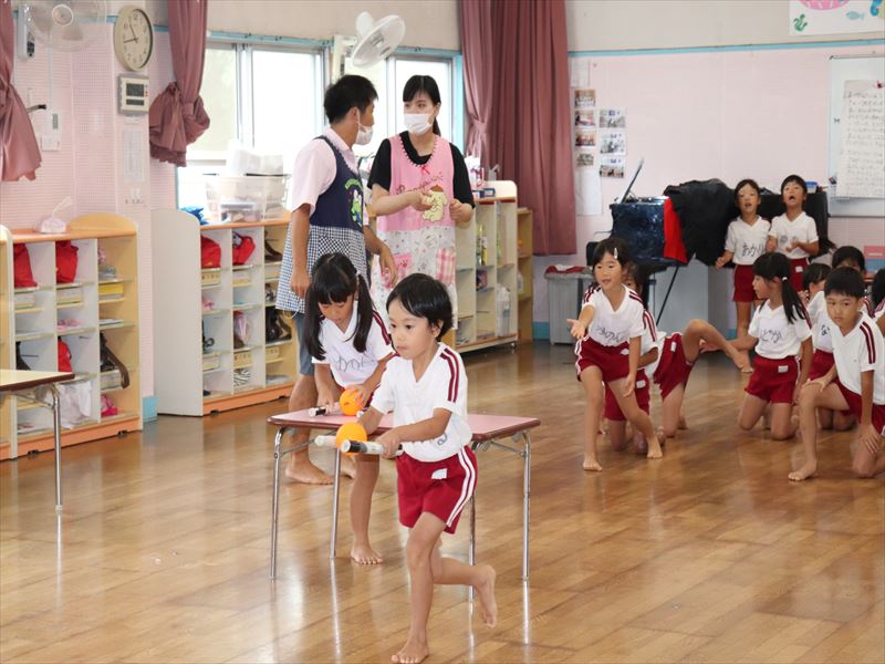 年長さんはホールで競争を楽しみました。