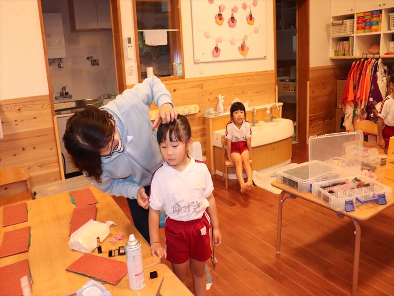 衣装撮影のため髪をセット中です