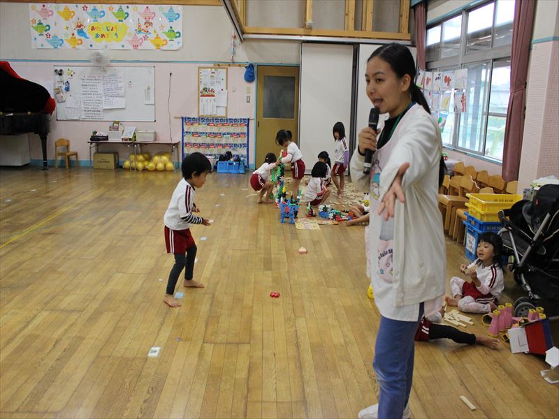 年中さん、ホールを使って練習です。