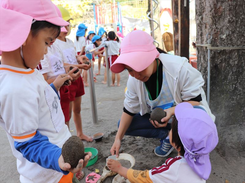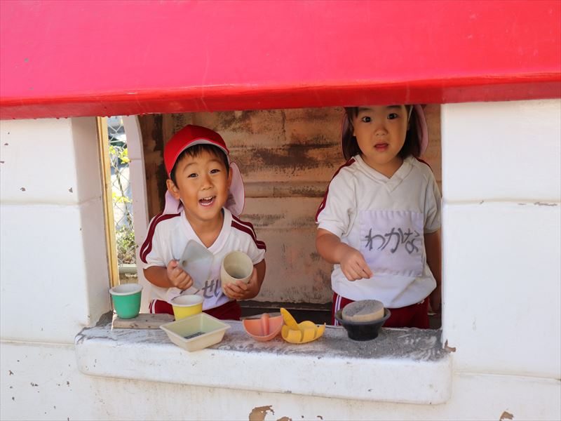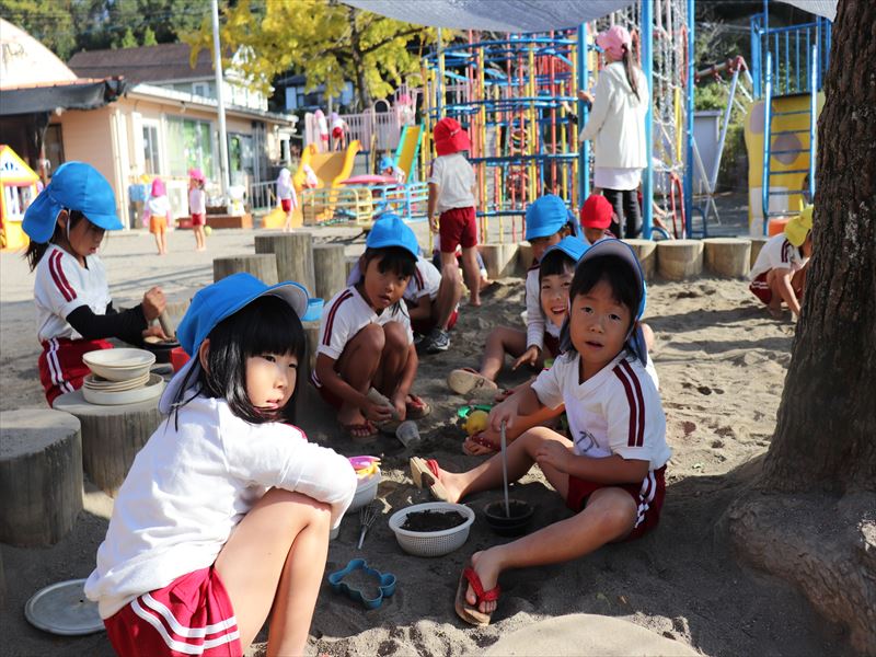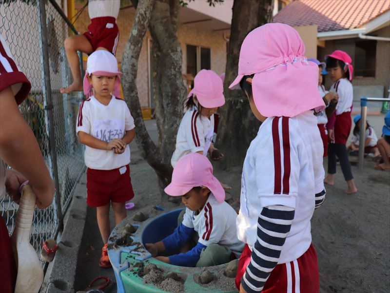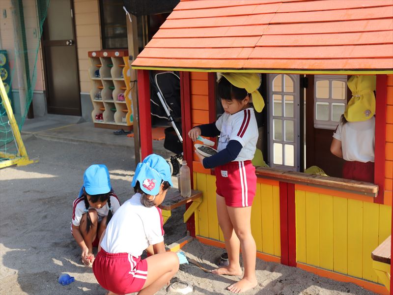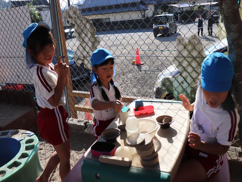 朝、ままごと遊びを砂場でしていました