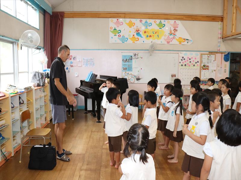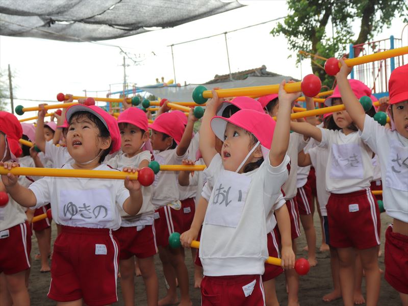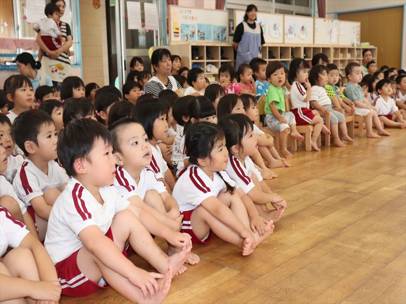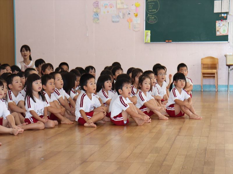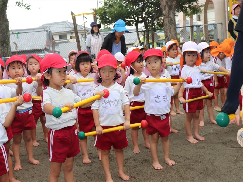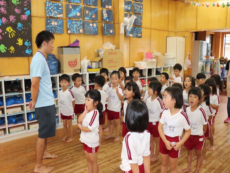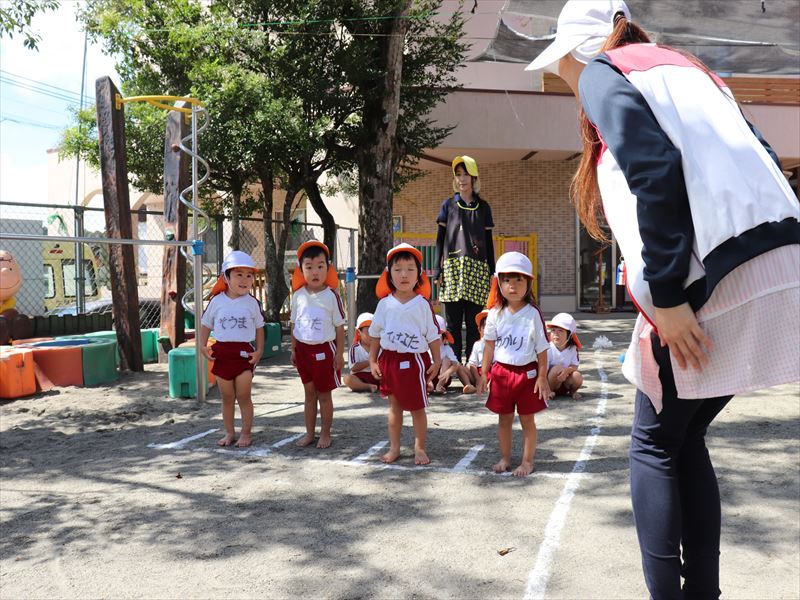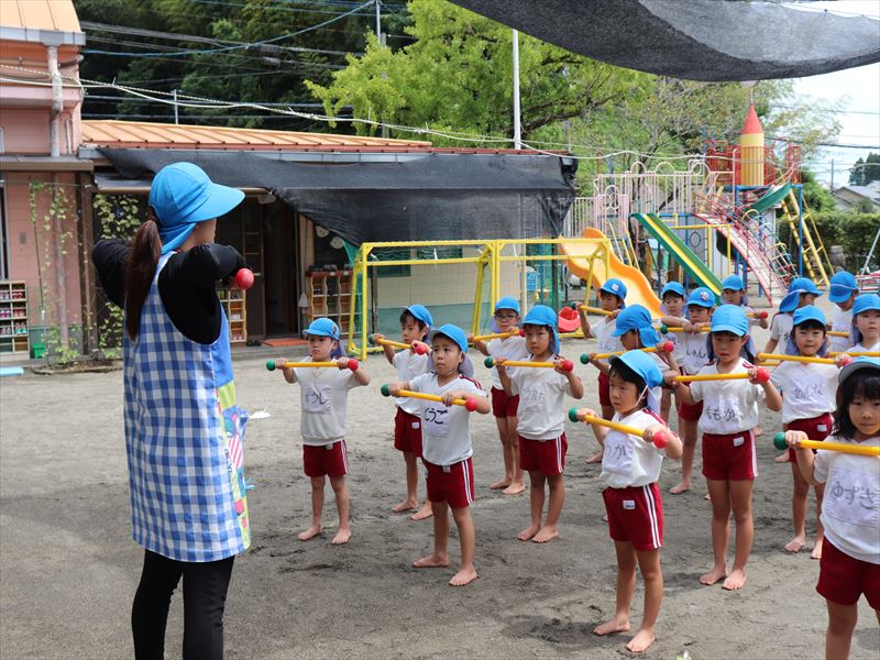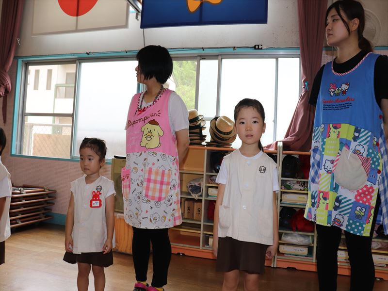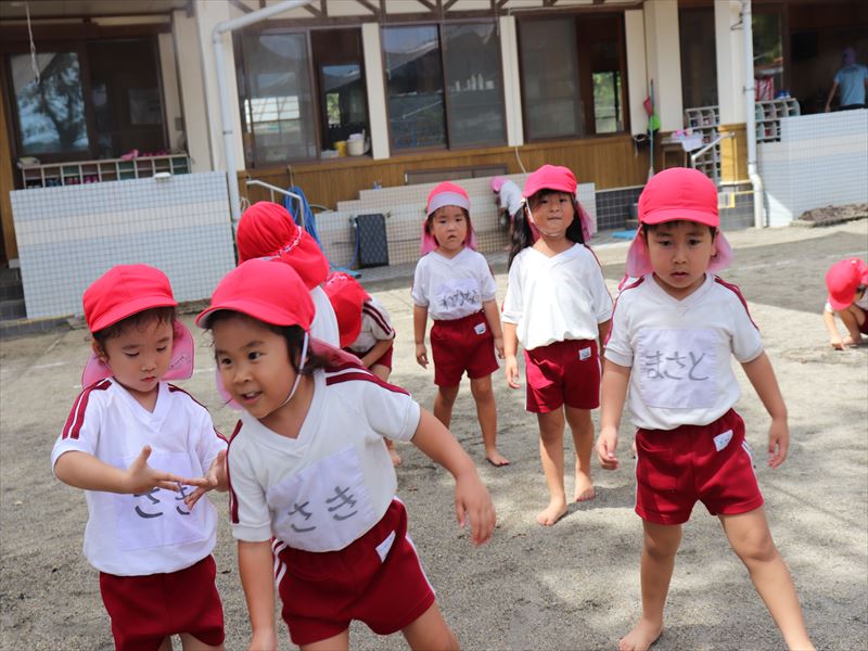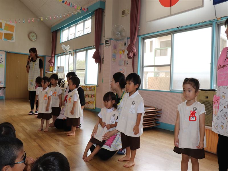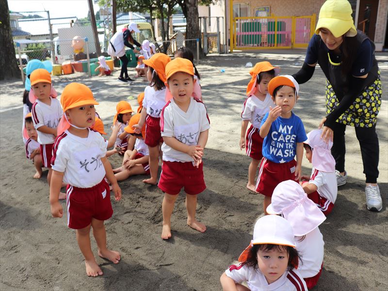 年中さん、運動会に向けまずは教室で少し練習です。