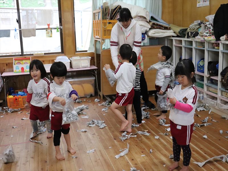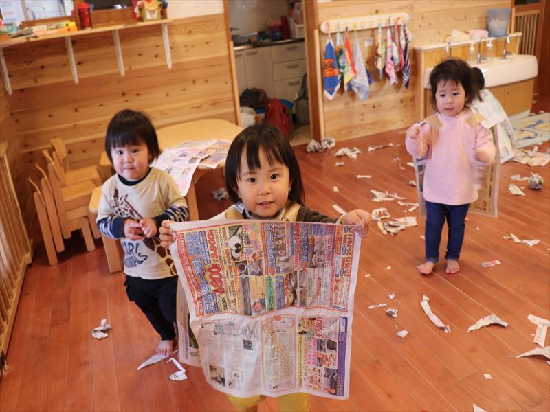 すずらん組さんは新聞紙あそび