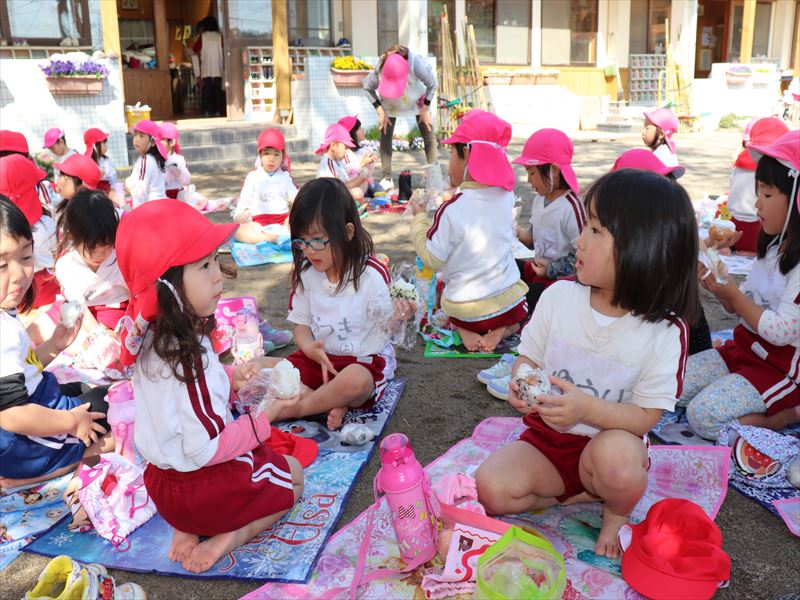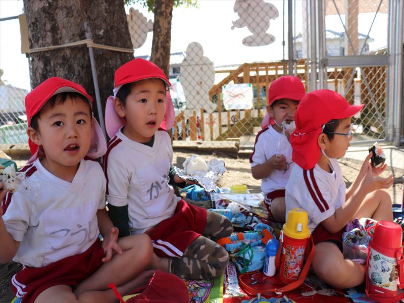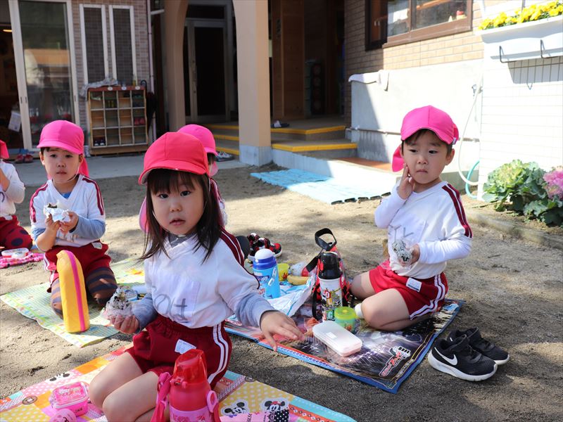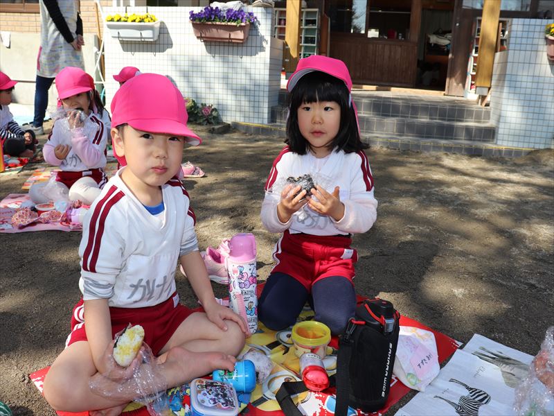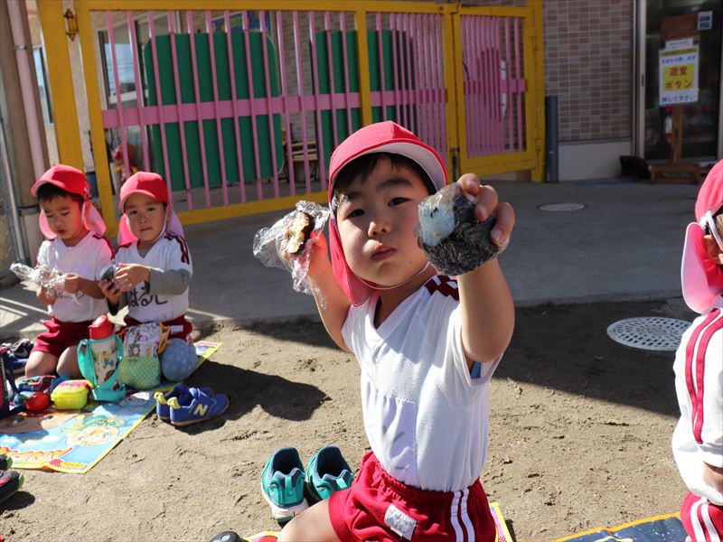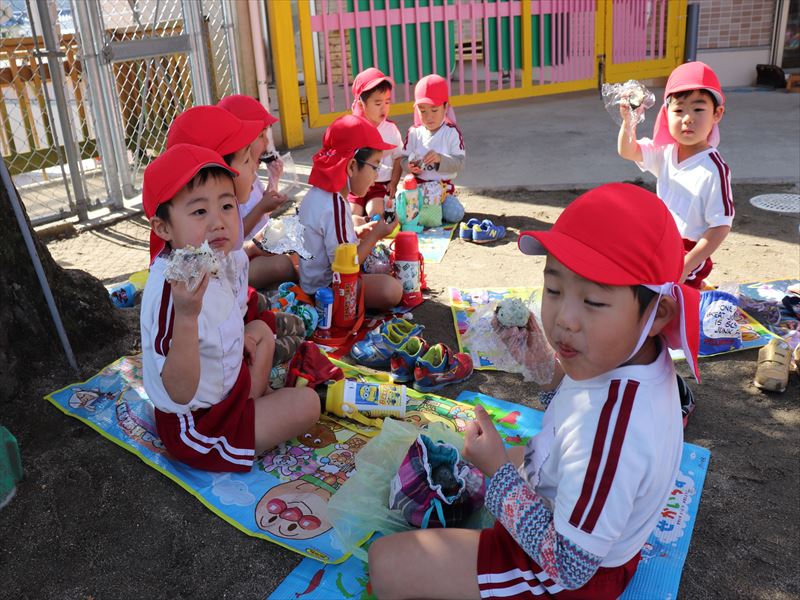 年少さんは外でおにぎりを食べました♪