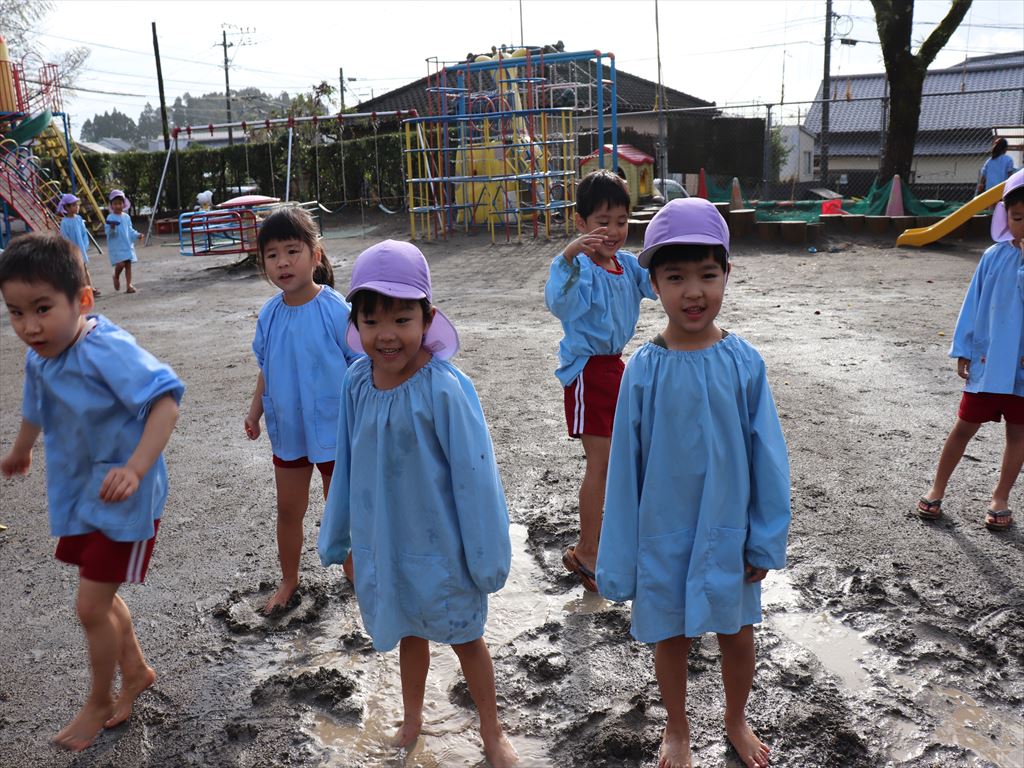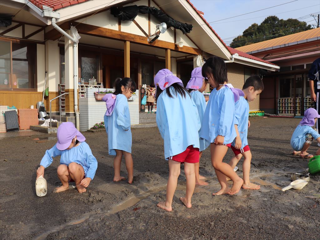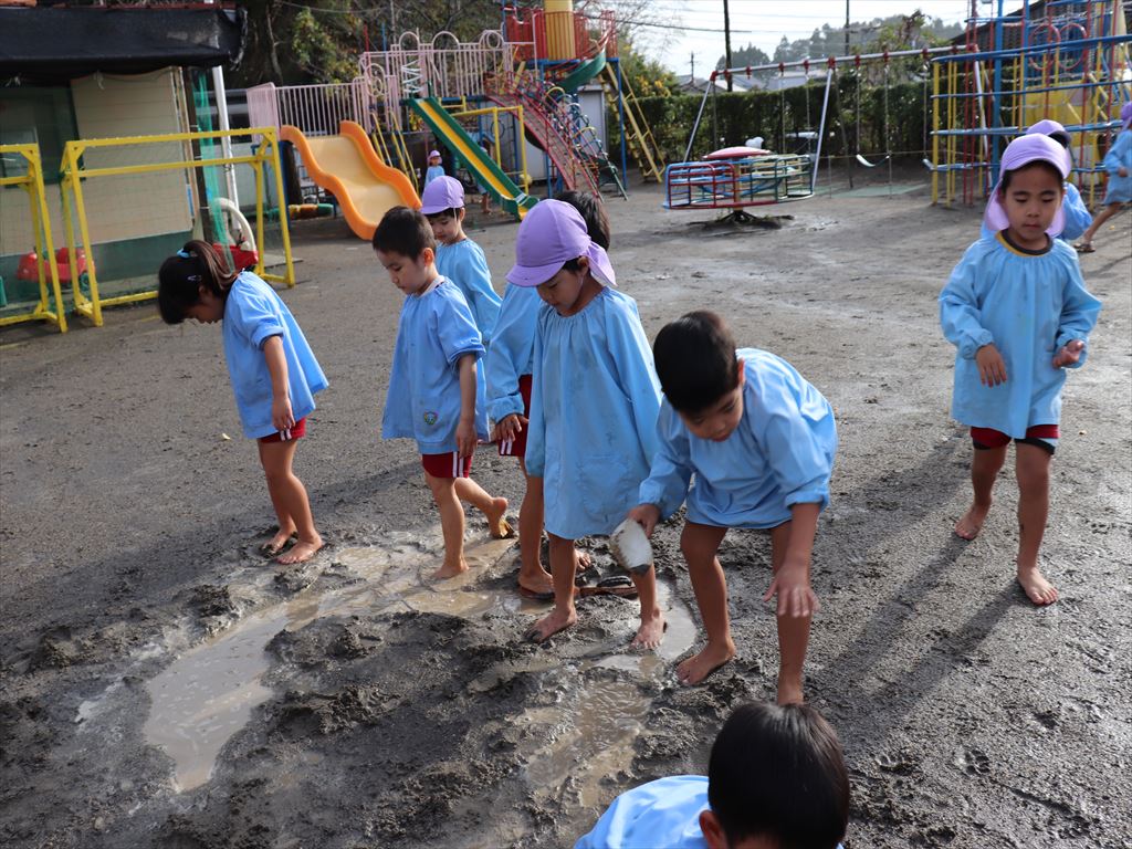 朝いちばんに年中さんが園庭に出て泥遊び★