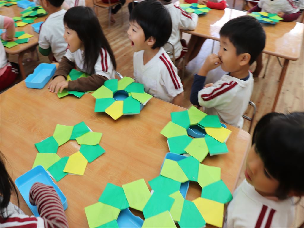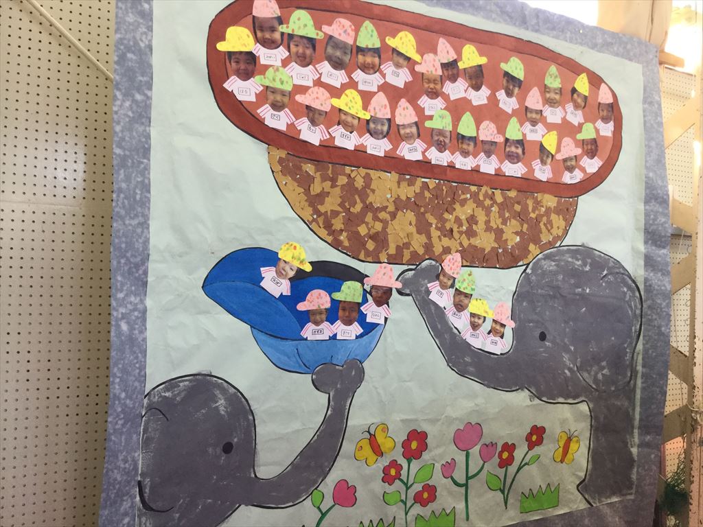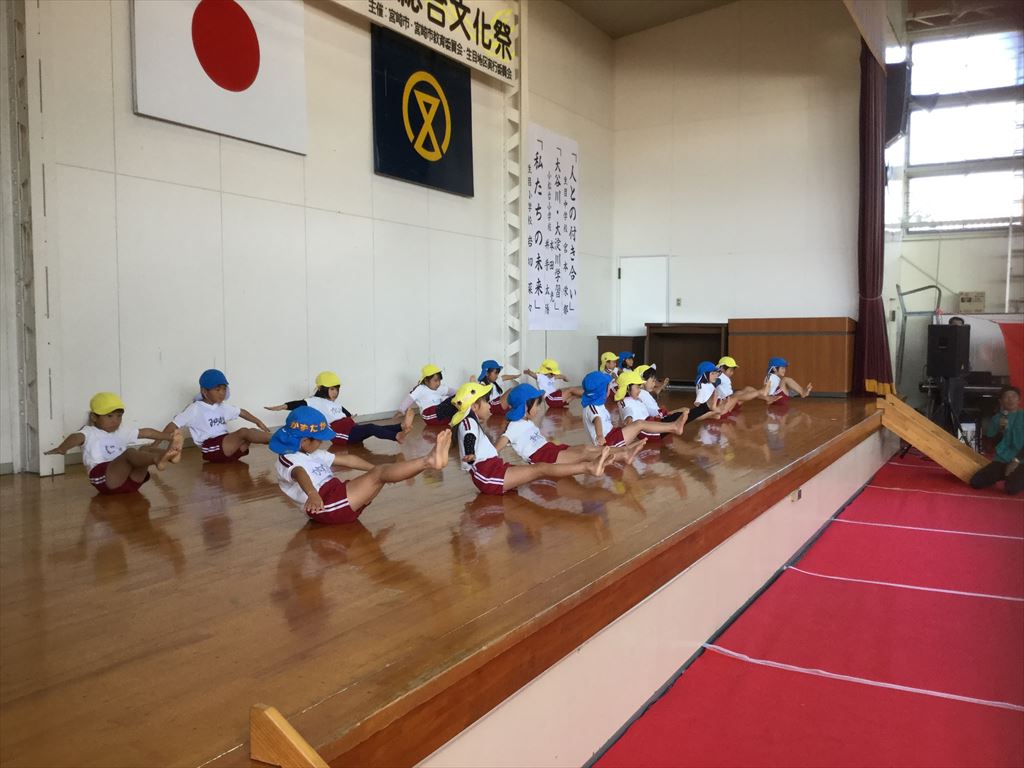 年少々さんの作品と、年長さんの希望者による組体操を披露しました。