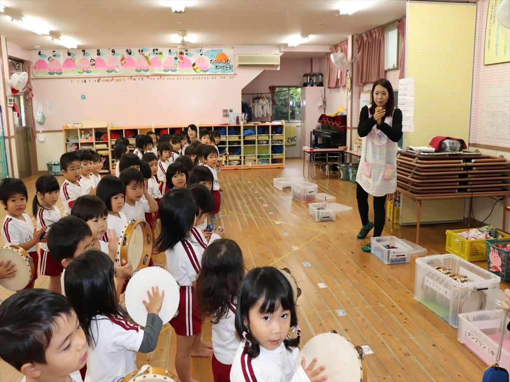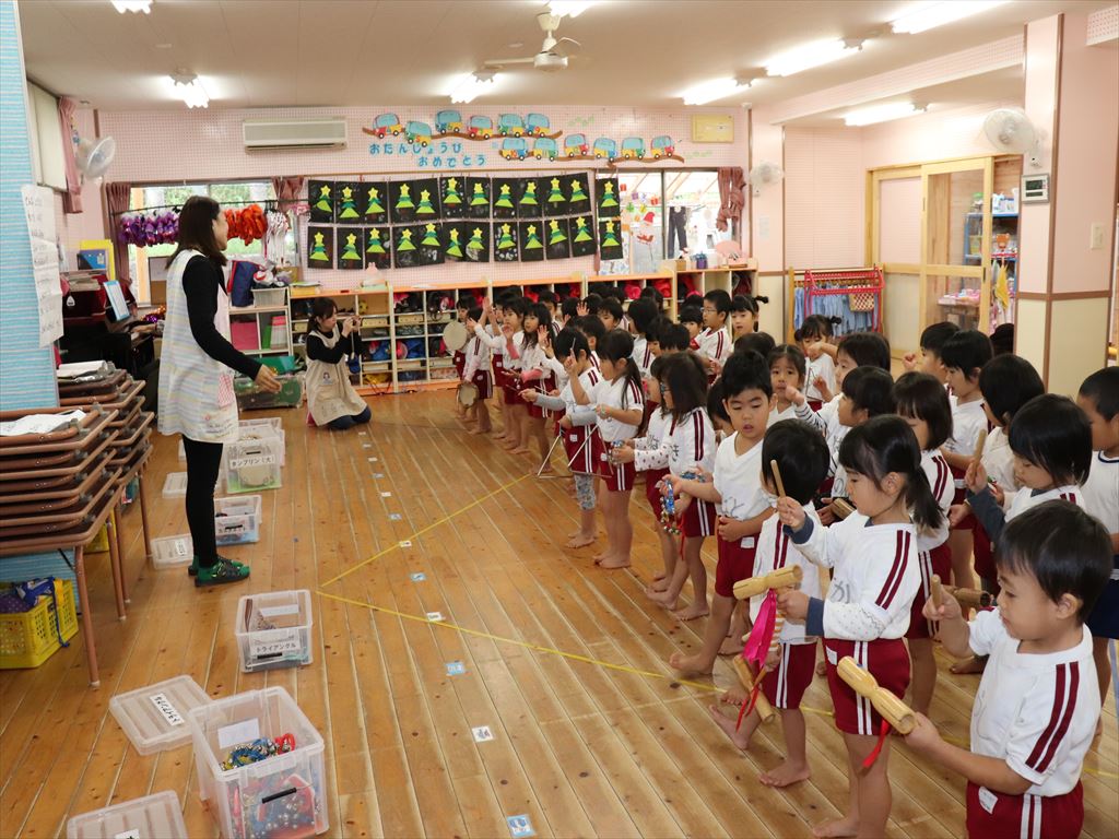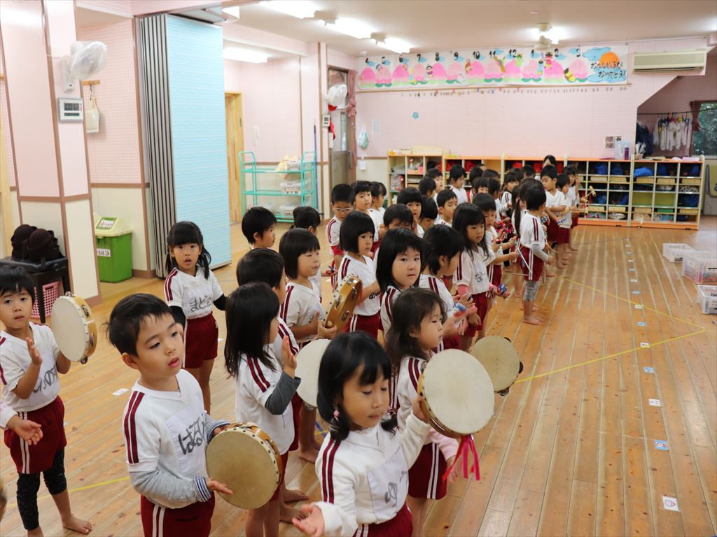 年少さん、楽器を使い合奏の練習です。