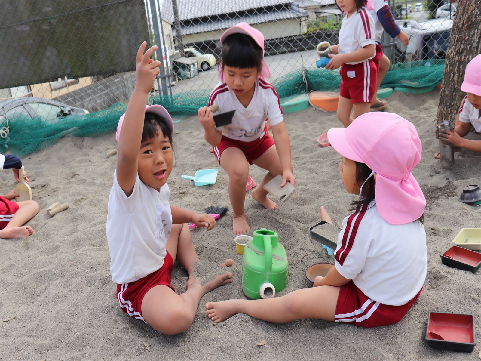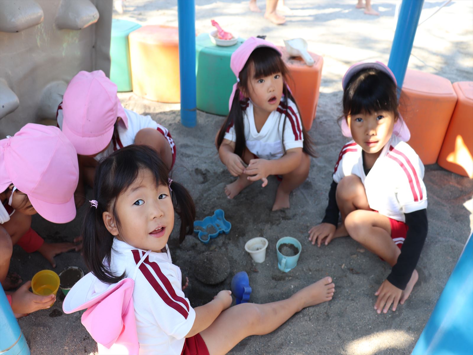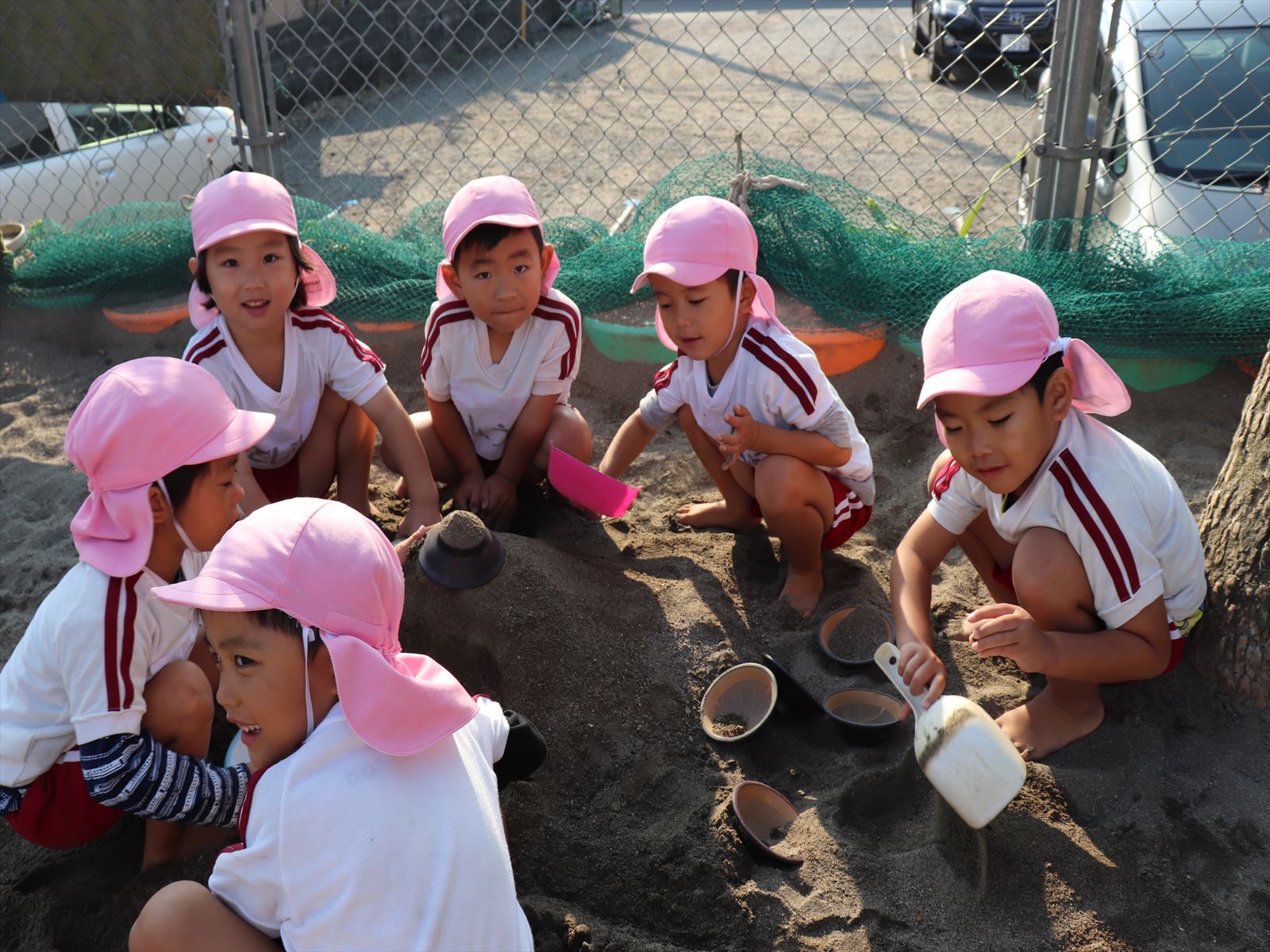 もも組さん、大きな砂山を作っています。