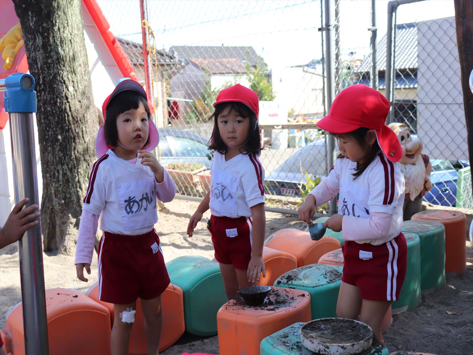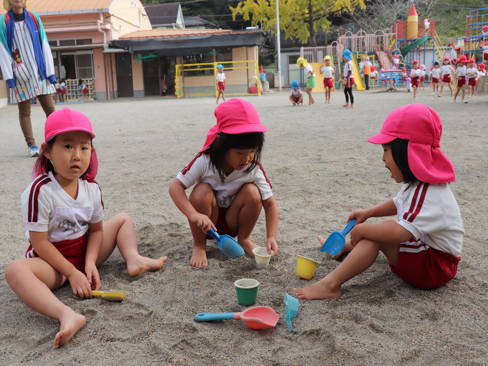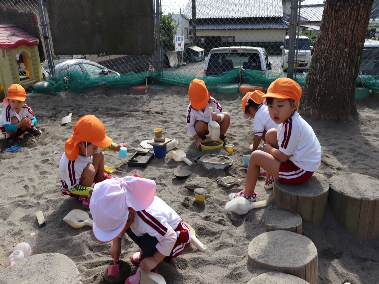 もも組さん、大きな砂山を作っています。