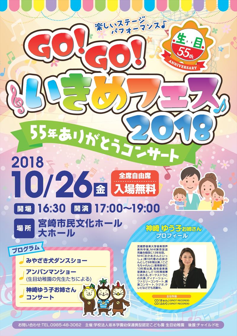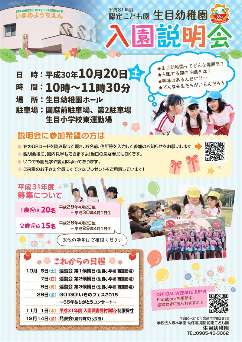 | 平成31年度の入園説明会を行います ご希望の方は、お気軽にご連絡ください♪ アプリでもお電話でもどちらかでもどうぞ! 日時:平成30年10月20日(土) 時間:10時~11時30分 場所:生目幼稚園ホール 電話:0985-48-3062 |