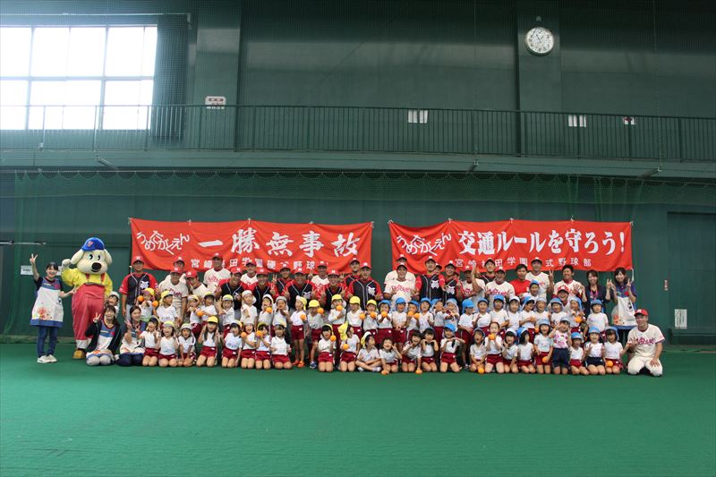 今日は、梅田学園の野球部の選手の皆さんが開いて下さった「交通安全指導と野球教室」に年長さんが参加してきました。