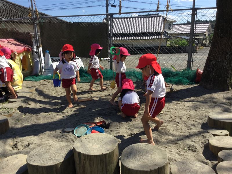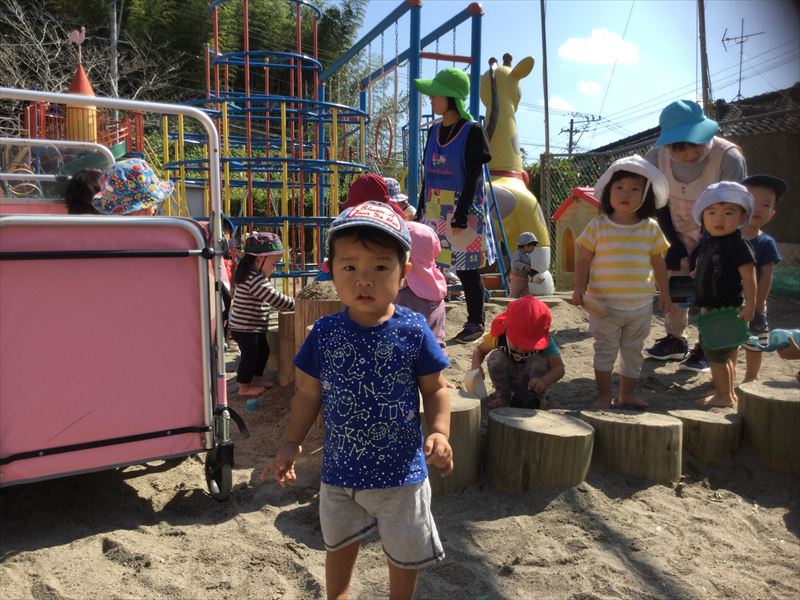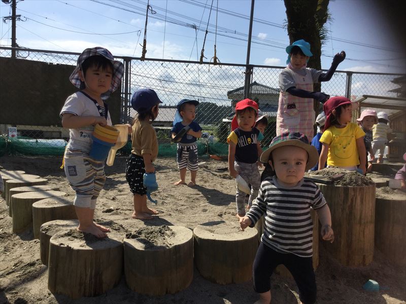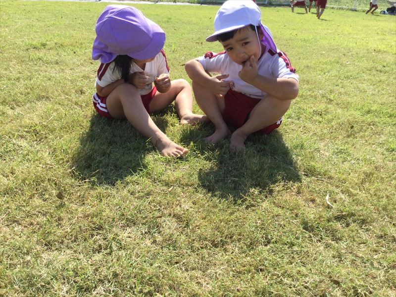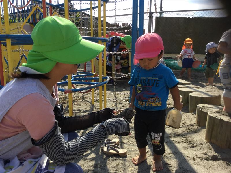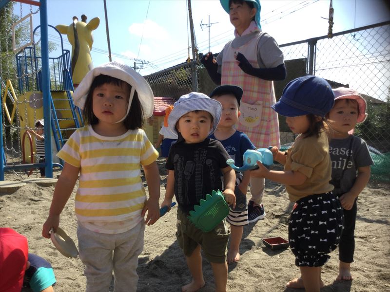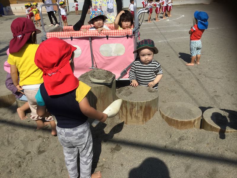 1歳児さん、運動会の練習の後は、砂場でのんびり遊びました。