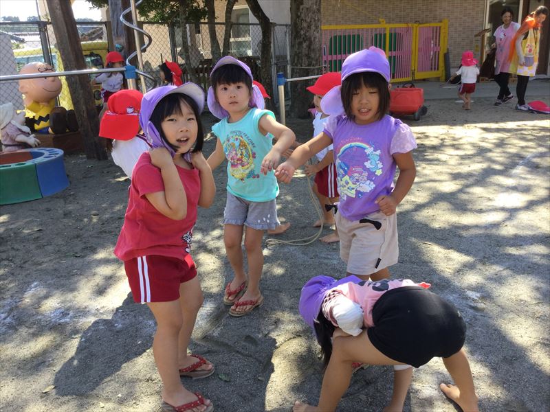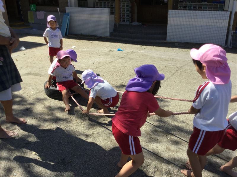 年長さん、ホールでみんなと協力し合っていました。