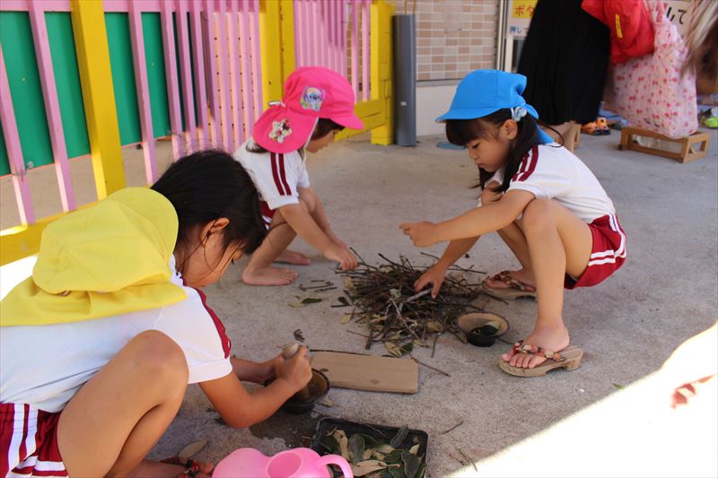 台風の風で落ちた木の枝や葉っぱが遊びになっていました。